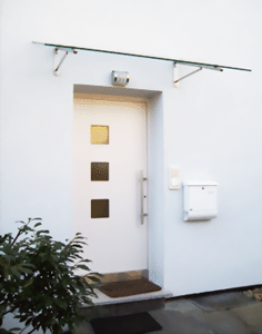 Modern und zeitgemäß ist unser Glas-Edelstahl-Vordach "Edition Pure" aus hochwertigem Verbund-Sicherheitsglas (VSG) TVG 12 mm mit eleganten Edelstahlhalter.